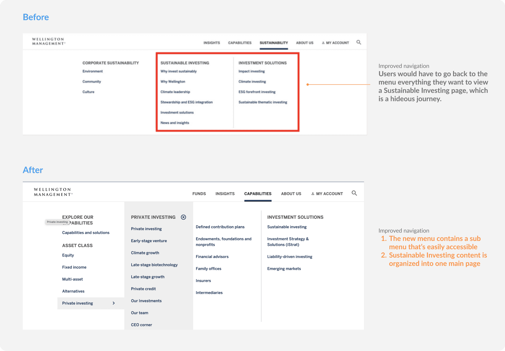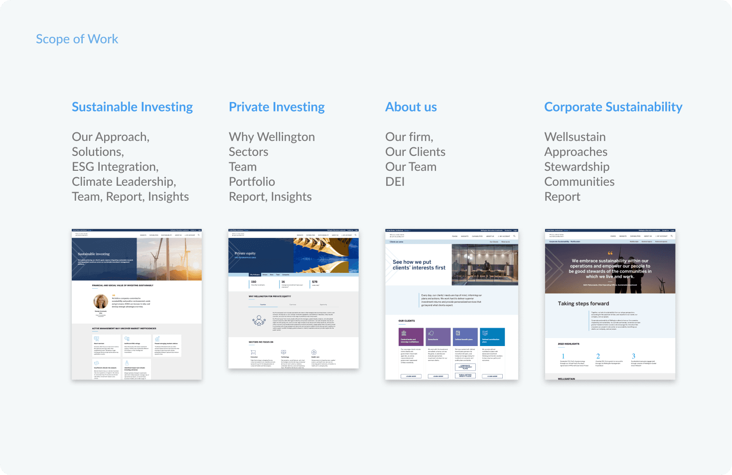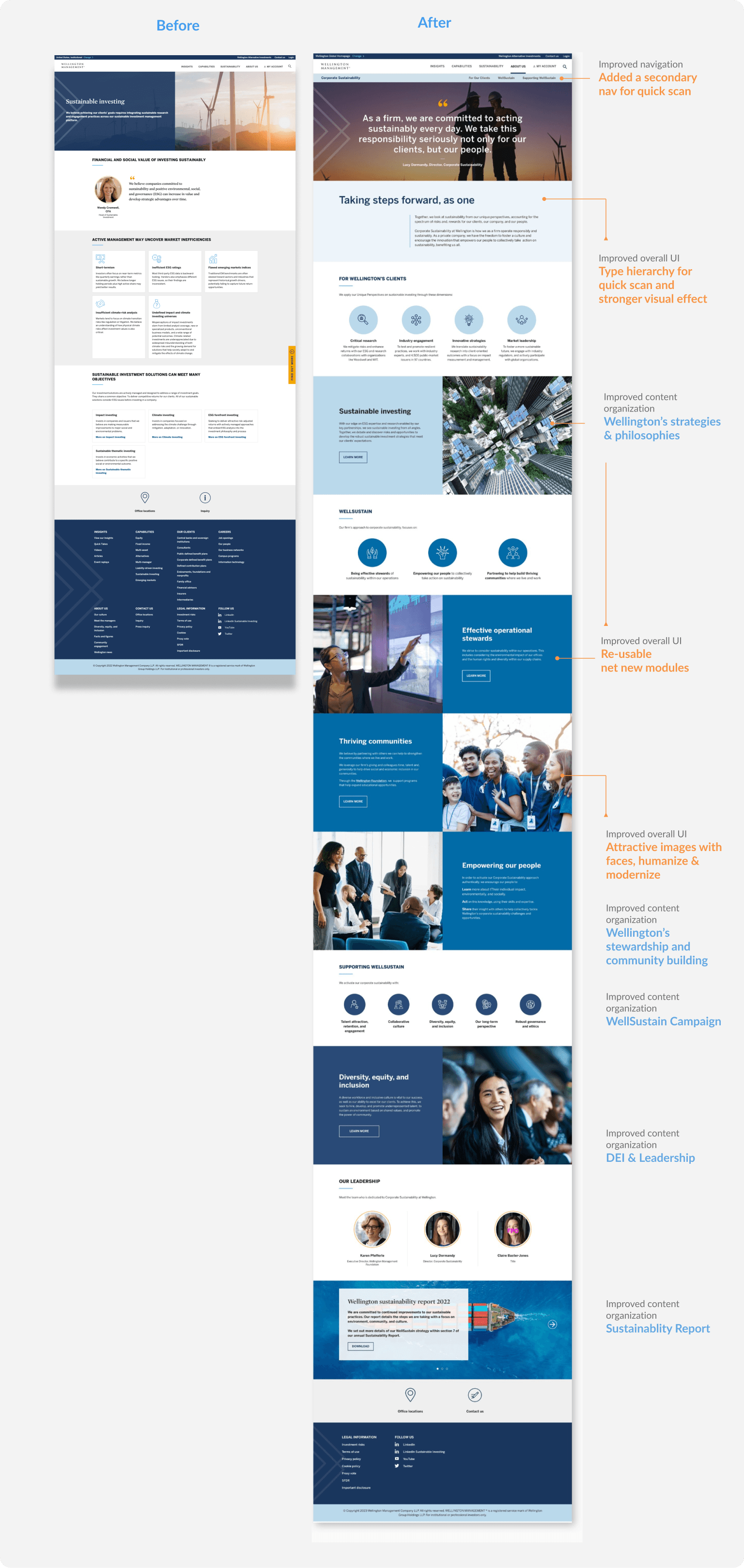 In the span of 6 months, we strategized and redesigned the experience of Sustainable Investing, Private Investing, About Us, and Corporate Sustainability. The resulting platform effectively communicates Wellington's brand identity while prioritizing user experience and adherence to compliance regulations and organizational requirements.